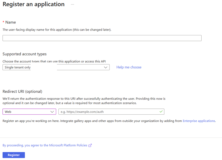 In the Supported account types select Single tenant only.