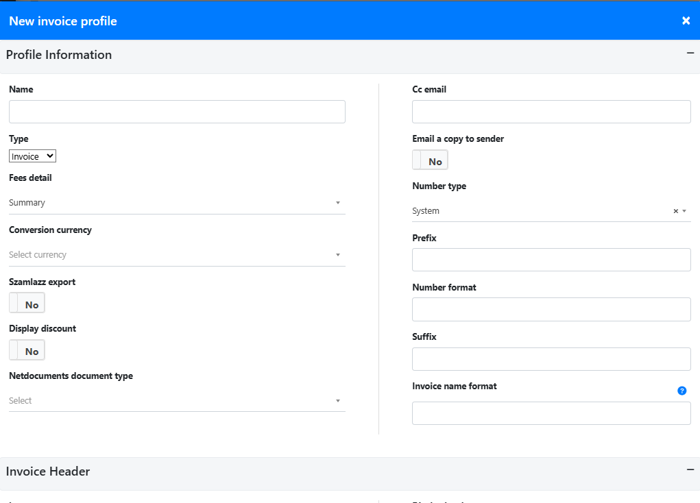 Type: Defines the type of the invoice profile, such as Invoice or Fee note.
